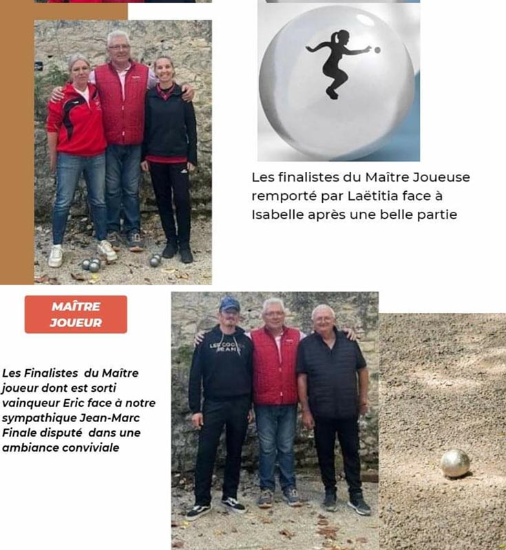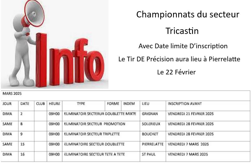 - Pour le challenge Guy Deyrieux du 21 juin 2025 à 15h vous pouvez vous inscrire à l'avance ou sur place le jour même, ce concours est limite à 100 triplettes.