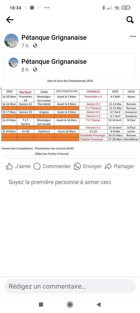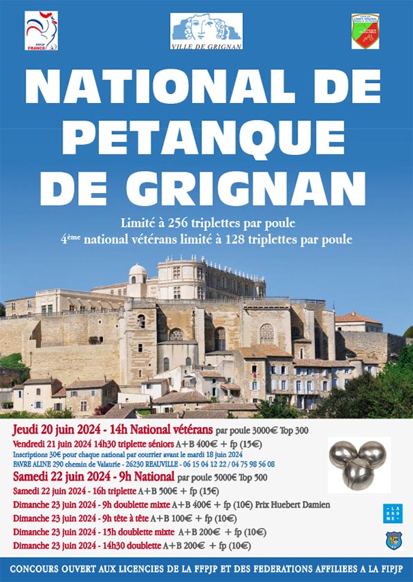 - Pour les nationaux de la pétanque Grignanaise 2022, les inscriptions sont closes et les tirages fait. Vous les retrouverez en page "National"