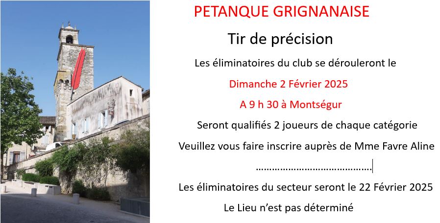 - Samedi 11 Septembre, La Pétanque Grignanaise organise un concours en doublette formée (Officiel avec licence) à 14h sur la place du Mail à GRIGNAN. Initialement prévu en Challenge "CROUZET", le concours est maintenu mais pas le challenge...